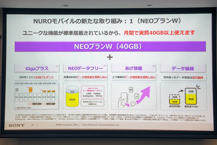 そのMVNOの中からここ最近、従来とは違った戦略を打ち出すケースが増えている。その1つが、ソニーネットワークコミュニケーションズがMVNOとして展開している「NUROモバイル」であり、先日3月8日に新しい料金プラン「NEOプランW」を発表している。