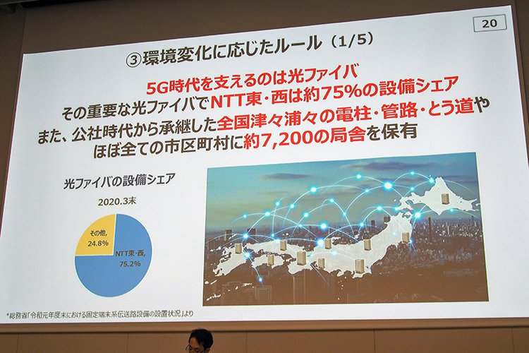 なかでも、NTTグループを巡って現在も問題視されているのが、国内の光ネットワークの存在だ。NTTは日本電信電話公社、要は国営だったものを民営化して設立された企業であり、公社時代に整備したネットワークや施設を多く保有している。それゆえ、国内の主要な固定通信網である光ネットワークは、NTT東西が圧倒的なシェアを誇っており、他社は携帯電話ネットワークを整備する上でも、NTT東西の光ネットワークを使わざるを得ない状況にある。