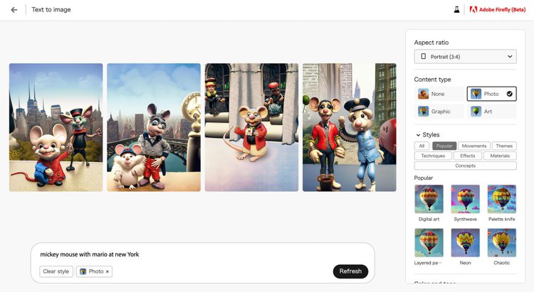 一方で面白いのは「著作権上の配慮」があることだ。たとえば、「mickey mouse with mario at new York」(ニューヨークにいるミッキーマウスとマリオ)という題材を出すと、一般的なジェネレーティブAIでは、ここに掲載するのがためらわれるような結果が出てくる。しかしFireflyでは、少なくとも「キャラクターがそのものズバリ」は出てこない。