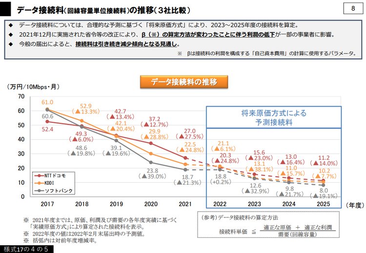 ただ、現在は状況が大きく変わっており、2023年にはデータ接続料が最も安いのはソフトバンクで、逆にNTTドコモは最も高くなっている。また、オプテージの「mineo」やソニーネットワークコミュニケーションズの「nuroモバイル」などのように、1社だけでなく2社、3社のネットワークを借りてユーザーが回線を選べる仕組みを提供するMVNOも増えつつあるなど、MVNO側のNTTドコモへの依存度も弱まりつつある。
