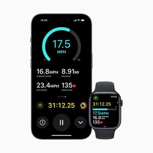 また、アクティビティ「サイクリング」が進化。watchOS 10を搭載したApple Watchでサイクリングワークアウトを始めると、ライブアクティビティとしてiPhoneに自動的に表示される。タップによって全画面表示となり、心拍数範囲、高度、レースコースなどの表示がiPhoneのディスプレイサイズに合わせて最適化されるため、iPhoneを自転車に取り付けて簡単に確認できるようになる。