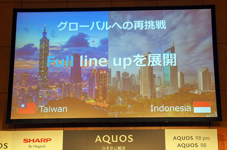 さらにもう1社、新たな動きを見せたのが国内メーカーのシャープである。同社は、7月3日に実施したスマートフォン「AQUOS」シリーズの新CM完成披露イベントで、台湾とインドネシアに向けて国内展開しているスマートフォンを、フルラインナップで展開することを明らかにしている。