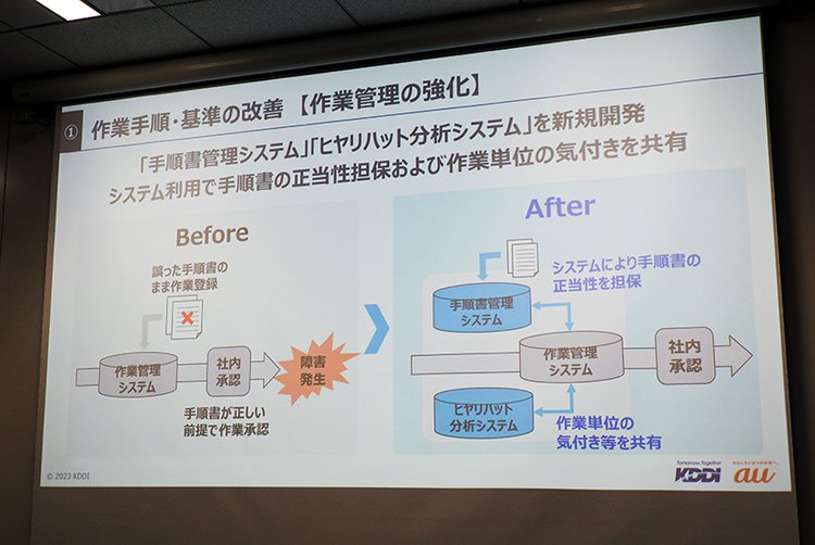 そこでKDDIでは1年をかけ、同様の通信障害を発生させないよういくつかの対策を実施している。1つ目は、通信障害の発端となった手順書の問題への対処であり、マスターとなる手順書をシステムで統一管理することでバージョンの管理を厳格化。さらにヒューマンエラーを減らす対策として、作業時に事故未遂となったいわゆる「ヒヤリハット」を分析し、それをシステムで共有することで作業員の気づきや啓発も進めるとしている。