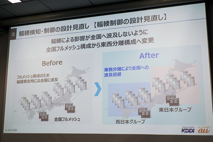 2つ目は、輻輳が全国に急速に波及する要因となったネットワーク構造の見直しだ。従来KDDIのネットワークは、全国のネットワークを網目状に結ぶことで負荷を分散し、通信障害の影響を軽減するフルメッシュ構成となっていたが、それが昨年の障害では裏目に出て、全国に輻輳を一気に広げる要因にもなってしまった。そこでメッシュを東西に分離することにより、地域を超えて輻輳の影響が波及しないよう構成を大きく変更したという。