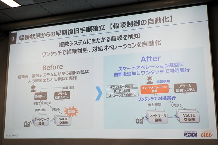 そして3つ目は、輻輳から早期復旧するため、対処を自動化することだ。実はKDDIは、ネットワークセンターの2拠点化を進めたのと同じタイミングで、監視や運用、障害への対処などを自動化し、ワンタッチ、あるいはゼロタッチで実施できる「スマートオペレーション」という仕組みを導入。従来技術者の経験と手作業に基づいて対処してきた、ネットワーク運用の手間を大幅に削減し、障害への対処を迅速化する取り組みを進めていた。