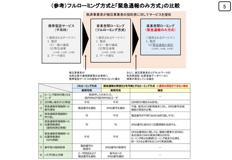 だが総務省は、携帯各社のトップが過去、各社が費用を負担して対処を進めると発言したことから、一連の対処に国は一切補助を出さないとの方針を示している。だが各社の発言を振り返るに、元々事業者間ローミングの早期実現のため、呼び返しはできないが技術的ハードルが低く、その分費用負担も少なくて早く導入できる「緊急呼発信のみローミング方式」の導入を念頭に置いていたと見られる。