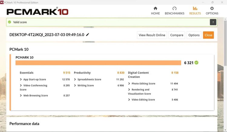 次に、PCの総合的な性能を測るPCMark 10だが、トータルスコアは「6321」、ブラウザ利用やアプリの立ち上がりなど日常的な作業のスコアであるEssentialsは「9515」、オフィス作業のProductivityは「8830」、写真や動画編集をともなうDigital Content Creationが「8158」となった。こちらも過去にROG Allyで計測したスコアとほぼ同等だ。