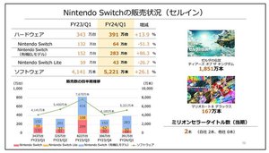 Nintendo Switch関連では、本体の販売台数が前年同期比13.9%増の391万台で、ソフトウェアの販売本数は前年同期比26.1%増の5,221万本。『ゼルダの伝説ティアーズオブザキングダム』が1,851万本の販売を記録したことにより、ソフトウェア販売本数が大きく増加しただけでなく、ハードウェアの販売へのけん引効果も見られたという。