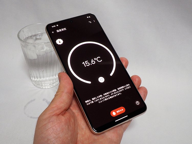 またPixel 8 Proだけの新機能として、温度計機能が搭載されている。Pixel 8 Proの背面、フラッシュの下は温度センサーが用意されており、専用のアプリを用いて非接触での温度測定が可能だ。測定方法は、アプリ上から「タップして測定」を押すだけと非常にシンプルだが、対象物との距離を5cm程度に保つ必要があり、赤外線タイプの非接触温度計と比べると、使い勝手や精度はいまひとつ、といった印象だ。