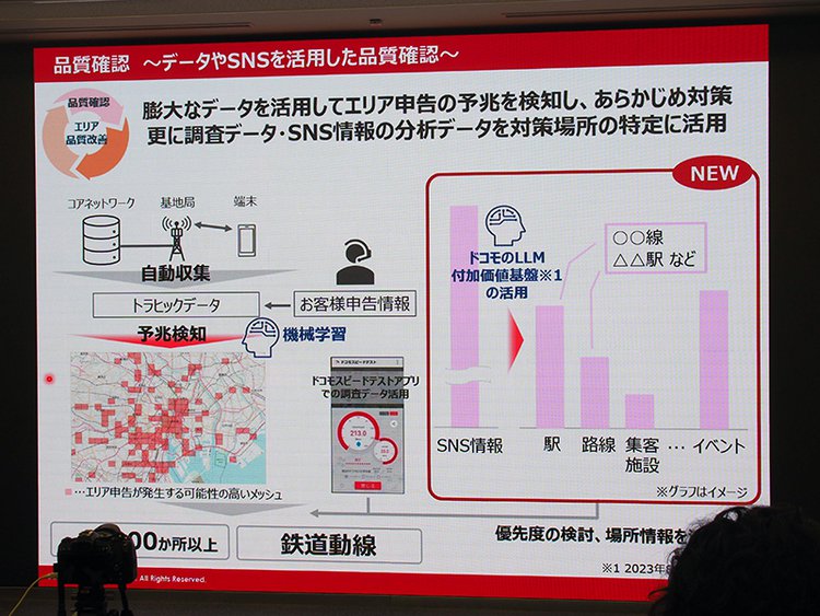 まず、通信品質を確認する部分に関してだが、NTTドコモでは新たに昨今話題となっている「生成AI」を活用した分析を導入している。NTTドコモはこれまでにも機械学習技術を活用し、ネットワークのトラフィック情報とユーザーからの声を掛け合わせてトラフィックが増加する予兆を検知することに力を入れてきたが、今回それに加えてNTTドコモが開発したLLM(大規模言語モデル)を活用。SNS上の「つながらない」などの投稿を生成AIによって分析し、通信品質対策が必要な場所を抽出できるようにしたとのことだ。