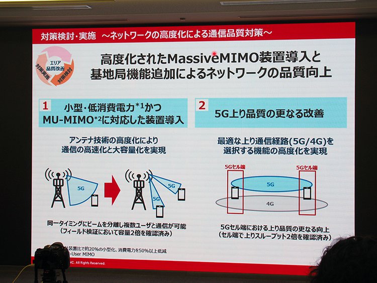 続いて、通信品質低下が低下している、あるいはその予兆がある場所に向けた対策についてだが、こちらに関しても新たな取り組みを行っている。1つは5Gのアップロード通信品質の改善で、基地局の高度化によって5Gと4Gのうち最適なアップロード経路を選択できるようにすることで、5Gエリアの端付近でのアップロード速度が2倍に向上したという。