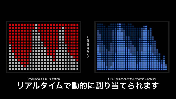 GPUについては、M1世代よりも最大2.5倍の速度でプロ向けアプリを実行できるとしており、「Appleシリコンのグラフィックスアーキテクチャにおける最大の飛躍」と同社は説明。リアルタイムでハードウェアのローカルメモリーの使用量を割り当てるDynamic Caching機能を新たに備える。これにより、タスクに必要なメモリの量を正確に使うことで、GPUの平均使用率が劇的に向上するとのこと。また、レイトレーシングも初めて利用可能となった。