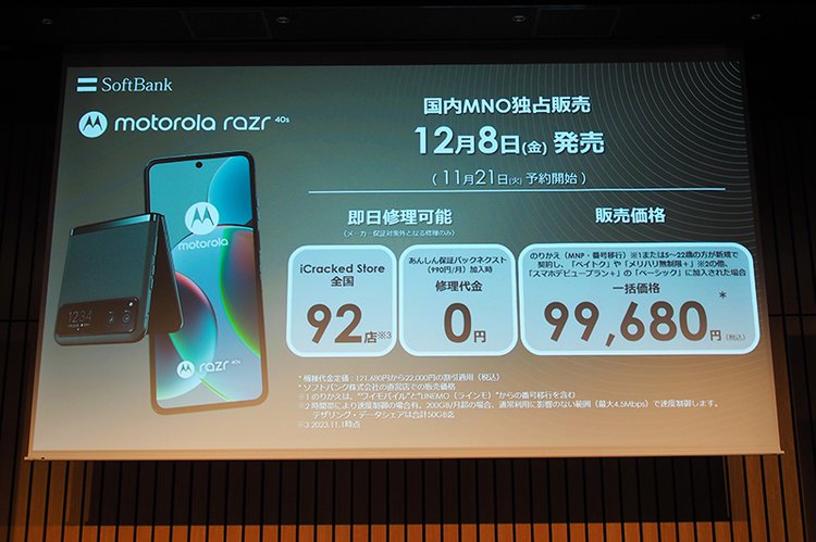 それゆえmotorola razr 40には、moto g53j 5Gの時と同じようにソフトバンク向けの兄弟モデル「motorola razr 40s」が用意される。こちらは、ハード面での性能に違いはないものの、カラーが1色増えて3色展開となるほか、ソフトバンク関連のアプリがプリインストールされて販売されるとのことだ。