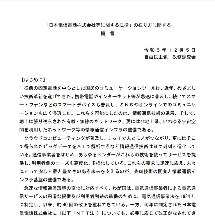 というのも、NTT法の見直し議論を進めていた政府与党である自由民主党(自民党)のプロジェクトチームが、同日12月1日に提言をまとめたとの報道がなされた。そして12月5日には、自民党の政調審議会が正式な提言を取りまとめたとしている。