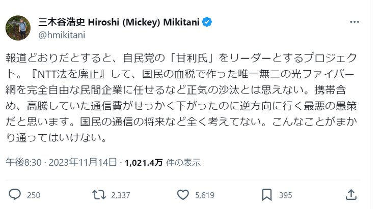 この電話加入権に関する話を組み入れたのには、およそ1か月前の11月14日からSNSの「X」(旧Twitter)で携帯各社のトップらが繰り広げていた議論が影響したと考えられる。これは、楽天グループの代表取締役会長兼社長最高執行役員である三木谷浩史氏が、同日に自民党のプロジェクトチームが提言案をまとめたとされる報道を受け、X上で「国民の血税で作った唯一無二の光ファイバー網を完全自由な民間企業に任せるなど正気の沙汰とは思えない」などとポストしたことに端を発する。