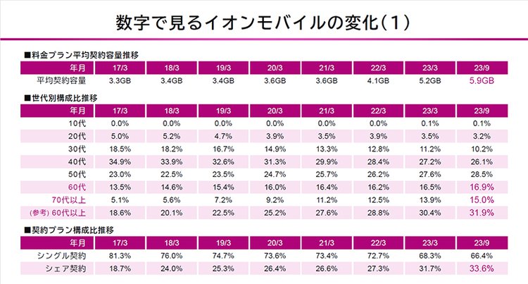 契約者で最も多い層は、スーパーマーケットの主要顧客にも重なる30〜50代のファミリー層だが、それに加えてイオンモバイルでは、やはりスーパーマーケットに訪れる機会が多い60代以上も多く獲得、その数は3割を超えているという。店舗を持たずオンライン主体でサービス展開している大半のMVNOが、オンラインサービスが苦手な傾向にあるシニア層の獲得に課題を抱えている中にあって、店舗を持つ強みを生かしシニア層をしっかり獲得している点が、イオンモバイルの大きな強みであることに間違いない。