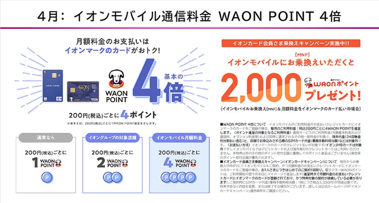 そしてもう1つは、イオングループの店舗や各種サービスとの連携がなされていること。例えば、イオンモバイルの通信料の支払いをイオンカードにすることで、イオングループのポイントプログラム「WAON POINT」が通常の4倍付与される仕組みなどが提供されており、イオンの店舗に訪れる多くの人にメリットを打ち出すことで契約獲得につなげているようだ。