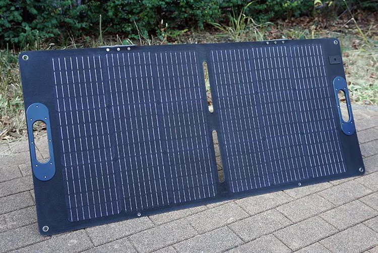 重量は4.3kgで、約60cm四方サイズに折り畳むことが可能。取っ手も付属しており、比較的手軽に持ち運びできる。さらに背面には、自立可能なスタンドが付属しているため、設置も非常に簡単に行えた。このように、高効率で持ち運びしやすいのはありがたいかぎり。屋外のキャンプやグランピング、さらに災害時まで重宝する。