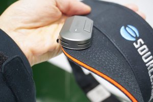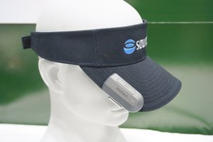 BirdieTalkのプロトタイプは、大きさが縦36mm×横57mm。ゴルファーがキャップやサンバイザーに装着して使えるサイズ感を目指す。本体にはワイヤレス通信用のチップとバッテリーのほか、マイクとスピーカーなどを内蔵する。