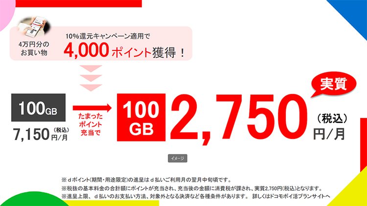ポイ活オプションによるポイント還元上限は月当たり4,000ポイントなので、10%還元キャンペーンの期間中はd払いで4万円の買い物をすれば上限の4,000ポイントが得られる計算となる。そのポイントを携帯電話の支払いに充てれば、実質的に月額2,750円で100GBの通信量が利用できるというのが、NTTドコモ側のアピールポイントとなっているようだ。