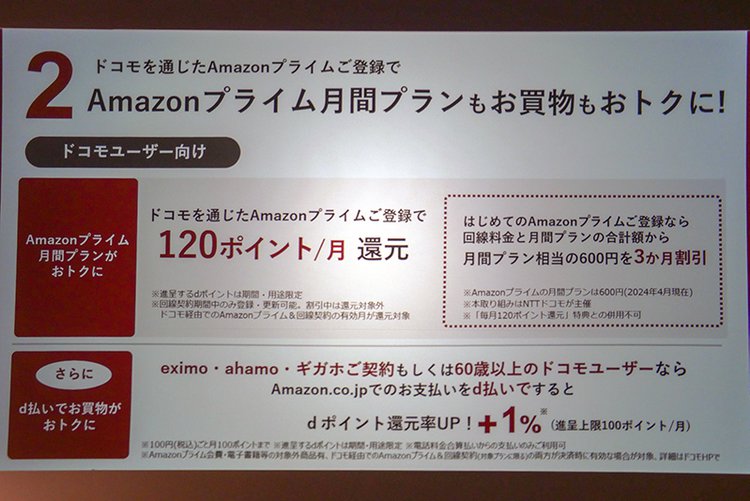 また、NTTドコモ経由でAmazonプライムを契約し、なおかつ「eximo」「ahamo」「ギガホ」を契約しているか、60歳以上であるという条件を満たすことで得られる特典もある。それはAmazonで「d払い」を用いて決済する際に、基本の0.5%に加え、さらに1ポイント分のdポイント(期間・用途限定)が付与されるというもの。一連の条件が全て揃えば、最大3.5%のdポイント還元が受けられるという。