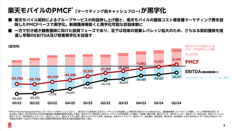 そして、契約数の伸びは売上の伸びへとつながることから、KDDIとのローミング契約継続による投資コストの抑制なども合わせて、楽天モバイルの赤字解消に向けた好材料となっている。実際、楽天モバイルの親会社である楽天グループは2024年度第2四半期決算で、マーケティング前キャッシュフロー(PMCF)が黒字化したことを明らかにしている。