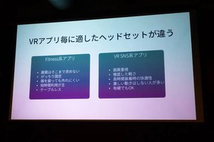 同社代表取締役社長CEOの岩佐琢磨氏は、製品コンセプトの背景として、VRアプリごとに適したヘッドセットの特徴が異なることに言及。フィットネス系アプリにおいてはしっかりと固定して短時間使用できれば良いとされる一方で、VRChatをはじめとしたVR SNSアプリでは、画質や軽さ、長時間装着時の快適性などが求められるという。またあまり動かないことから、VR SNSアプリでは有線接続のほうが好まれるそうだ。そのため本機は、商品の企画段階からVRChatに特化することを考えたとしている。