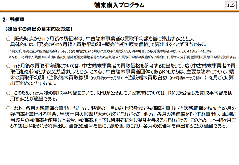 そして総務省は、一部事業者が買取価格をあえて他社よりも高くし、端末購入プログラムで激安を実現する要因になっていると指摘。そこで総務省は、予想価格に際が生じないよう端末価格を統一化することを打ち出しており、その基準として中古携帯ショップの団体であるリユースモバイルジャパン(RMJ)の買取平均額を用いることとしている。