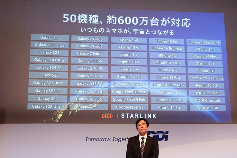 なおサービスが利用できるKDDIの「au」ブランドの利用者で、当面は申し込み不要、かつ無料で利用できるという。しかもau Starlink Directは、既存の多くのスマートフォンが対応している2GHz帯を衛星との通信に活用することから、対応機種も50機種と非常に多いようで、実証実験で用いられていたAndroidスマートフォンだけでなく「iPhone 14」シリーズ以降のiPhoneにも対応するという。