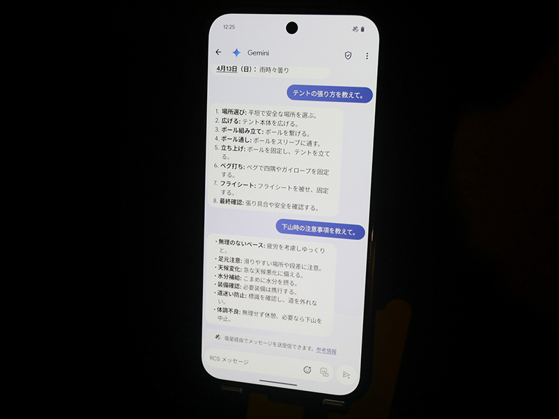 さらにAndroidスマートフォンであれば、Googleメッセージアプリを通じてGeminiとチャットをすることも可能だ。Webサイトなどへのアクセスはできないが、Geminiを使うことでさまざまな調べ物もできるだけに、日常から緊急時まで幅広いシーンで役立てられる可能性があるだろう。