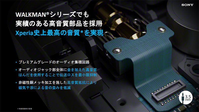 そこでソニーには、ユーザーの利便性を高めながらもXperiaシリーズらしい個性を両立することが求められているのだが、Xperia 1 VIIでは特にオーディオ関連で強い個性を打ち出している印象だ。実際Xperia 1 VIIは音楽プレーヤー「ウォークマン」の技術を取り入れ、3.5mmのオーディオ端子部分に金を加えた高音質のはんだを使用、伝送ロスを最小限に抑えるなどして、有線イヤホン接続時の音質向上を図っている。