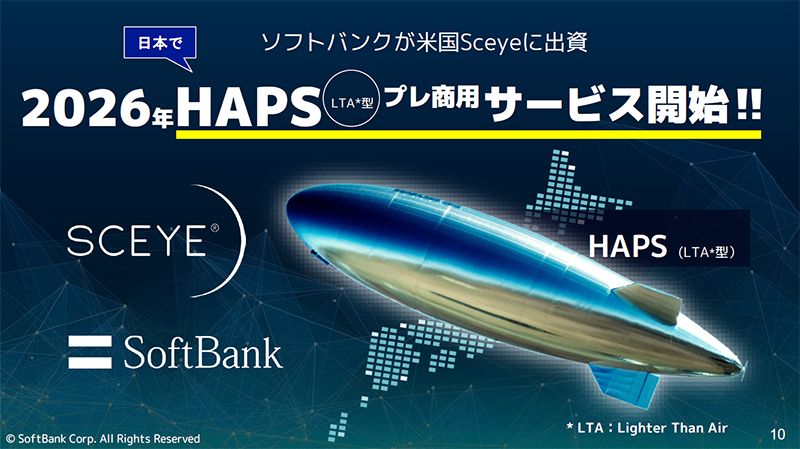 ソフトバンクはこれまで、翼を持ち太陽光をエネルギーにして飛行するHTA(Heavier Than Air)型の機体を用いたHAPSの開発に注力してきたのだが、今回プレ商用サービスに用いるHAPSは、飛行船のようにヘリウムガスによる浮力を用いて飛行する、LTA(Lighter Than Air)型の機体を採用している。そのためソフトバンクは、LTA型のHAPS機体開発を手がけるSceye社に出資し、日本国内でのサービス展開の独占権を取得したとしている。