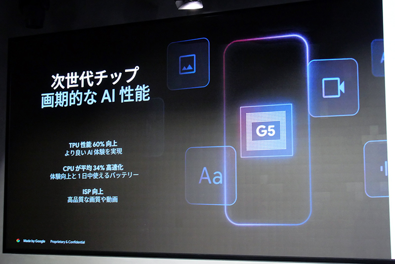 もう1つはチップセットの進化とAIであり、全モデル共にチップセットにはGoogleが開発した最新の「Tensor G5」を採用している。Tensorシリーズは従来、韓国サムスン電子が製造を担っていたのだが、Tensor G5では台湾の台湾積体電路製造(TSMC)の製造に変更、同社の3ナノメートルのプロセスで製造されたことで、更なる性能強化が図られている。