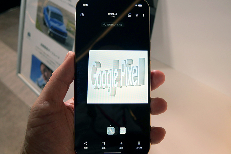 そしてもう1つは、Pixel 10 ProとPixel 10 Pro XLでのみ利用できる「超解像ズームPro」というもの。両機種は共に光学5倍相当の望遠カメラを搭載しており、デジタルズームであれば最大で100倍のズームが可能。ただそれだけ高倍率でデジタルズームをすると、いくらカメラの性能が良いとはいえ被写体がかなり粗くなり、AI技術を用いた従来の「超解像ズーム」でも補正に限界が生じてしまう。