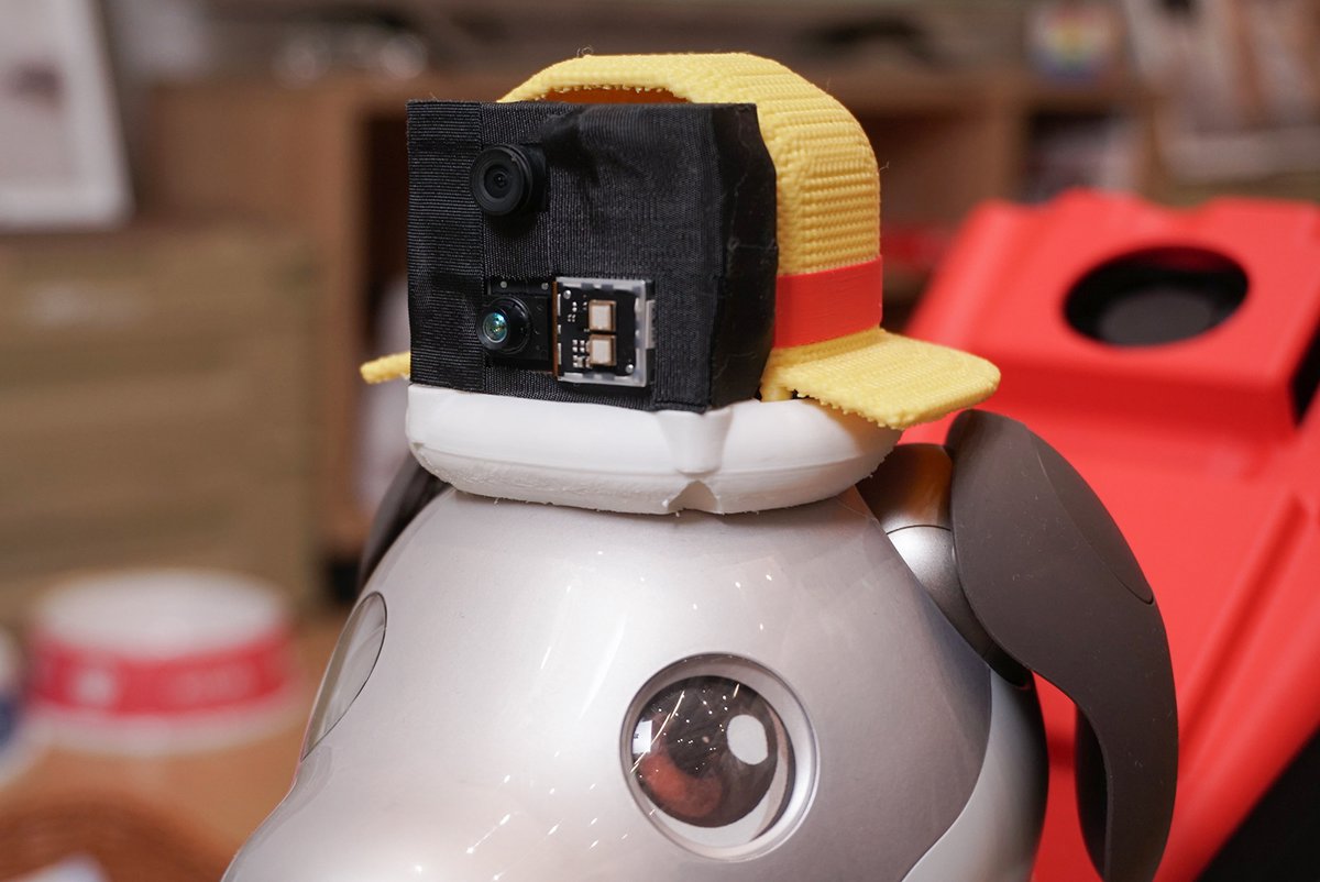 今回ソニーが展示したaiboの試作機は、環境の立体情報をさらに高精度に認識する技術を高めたと宇佐美氏は説明する。革新の鍵はaiboが頭に載せている「帽子」のようなユニットに内蔵するセンサー群と新しいソフトウェアにある。試作機はそれぞれを動かすためのMCU(マイクロコントローラー・ユニット)を背中に乗せた “ランドセル” や “マント” に仕込んでいる。