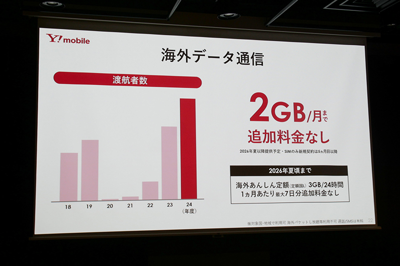 2つ目は追加料金不要で、海外でのデータ通信を月当たり2GB分利用できるようになったこと。ただこちらは開発の都合上、提供開始2026年夏以降と先になる予定であることから、それまでは24時間当たり3GB分のデータ通信が利用できる「海外あんしん定額」(24時間当たり980円から)を、最大7日分追加料金なしで利用できる施策を実施するとのことだ。