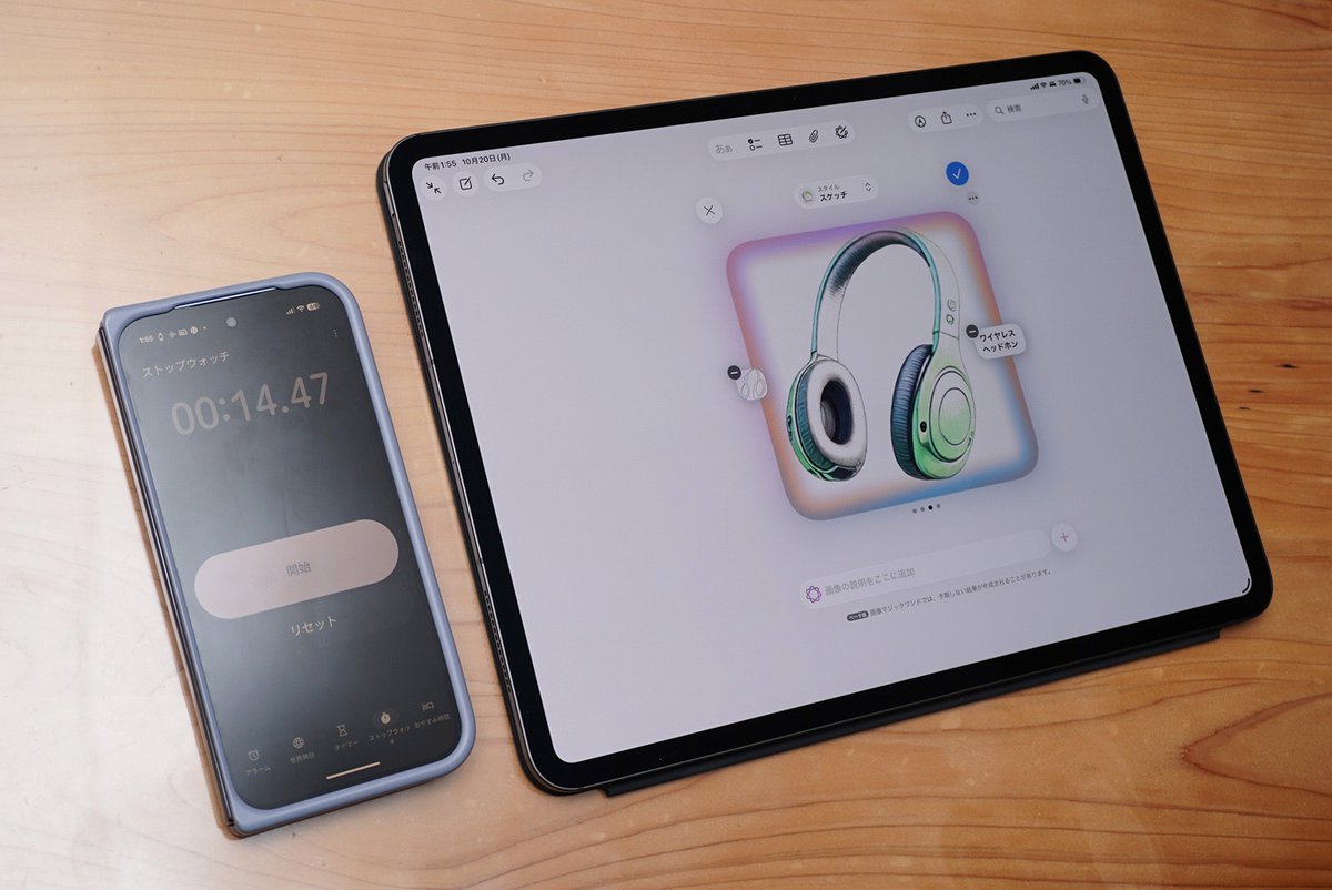 iPadOS標準のメモアプリで、Apple Pencilによる手書き入力に最適化したApple Intelligenceの機能「画像マジックワンド」を使って「ワイヤレスヘッドホン」を描いてみた。ここでもやはり数秒ほど、M5チップを搭載するiPad Proの方がM4搭載機よりも速く画像を生成した。