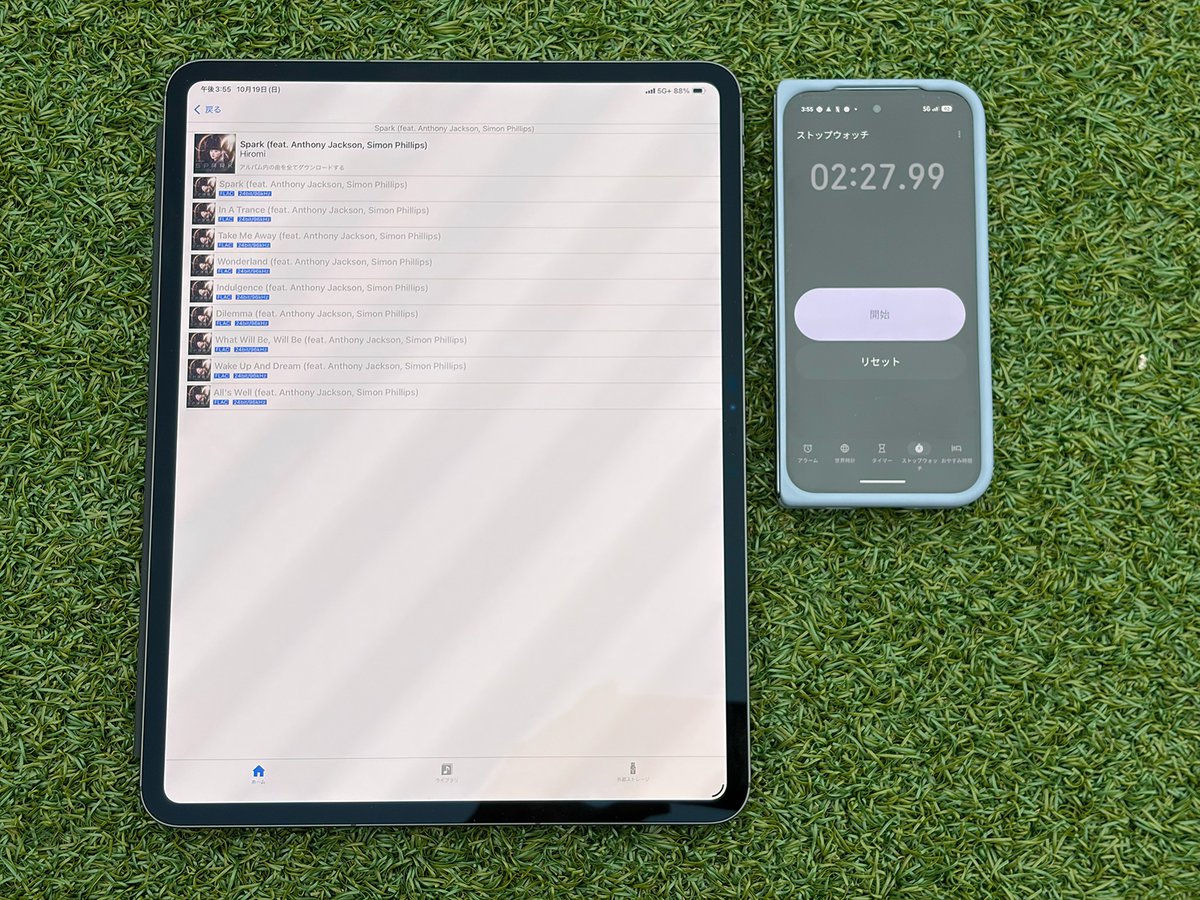 今回はWi-Fi+CellularモデルのiPad Proを試すことができたので、Moraで購入した全9曲(2.4GB)のハイレゾ音質のアルバムをNePLAYERアプリからダウンロードしてみた。ソフトバンクの5G SAネットワークに接続して、かかった時間は約2分27秒だった。最新のiPad Proでストレスフリーな高速ダウンロードができると言ってよいだろう。