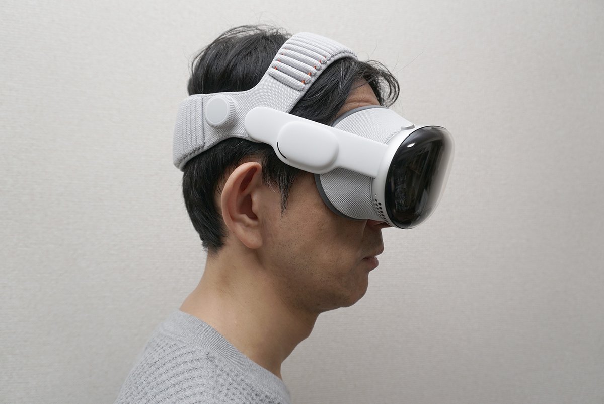 ソロニットバンドではライトシールと、後頭部をストラップで締めて安定させる必要があるため、ライトシールを眉間のあたりに強く押しつけながら装着してしまう。長時間使用すると疲れることがあった。デュアルニットバンドはApple Vision Proの重さが均等に分散されるので、長時間の利用がかなり楽になる。
