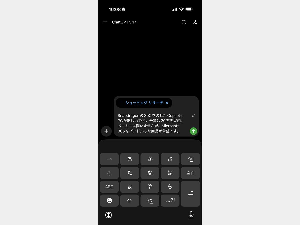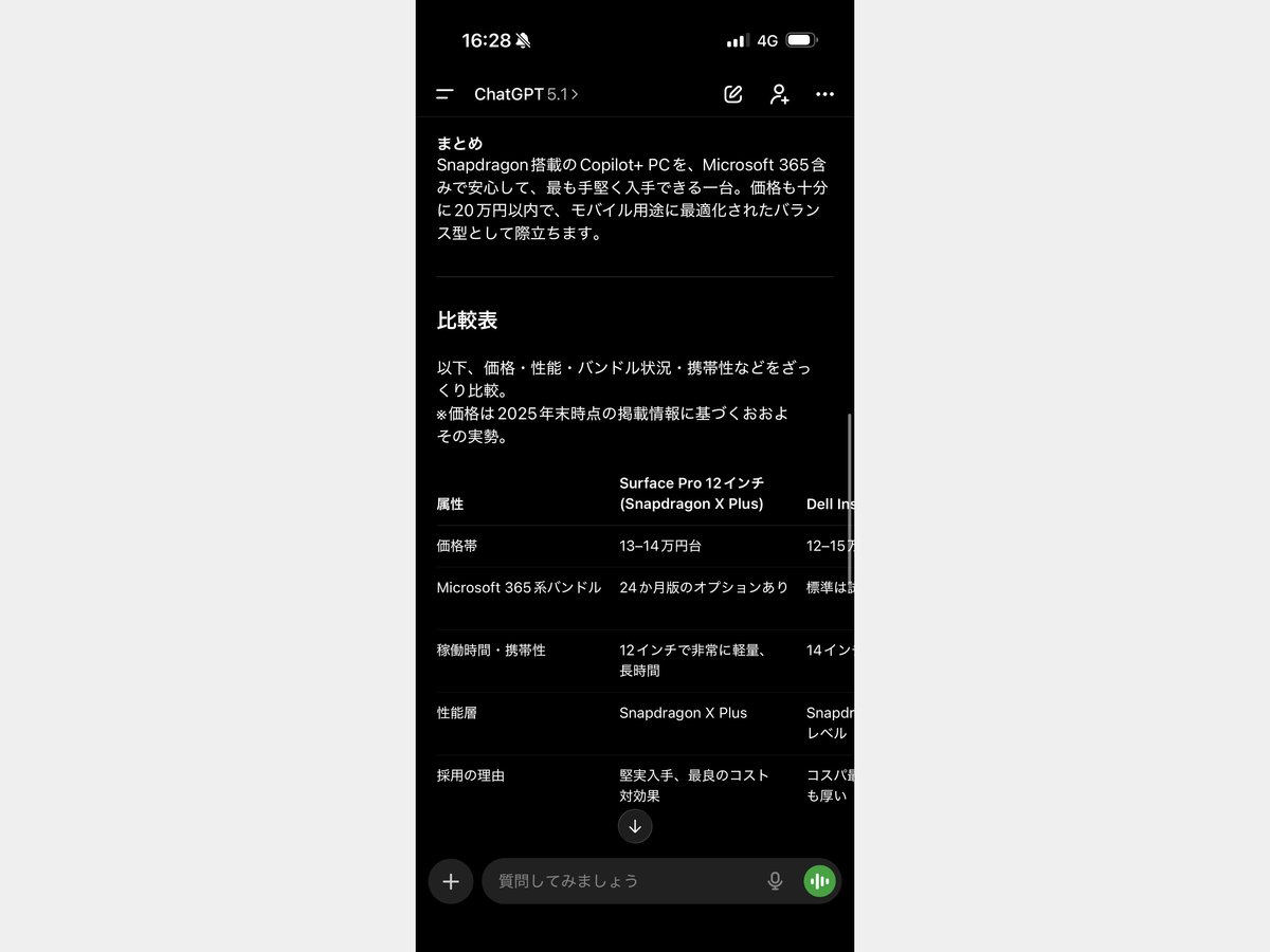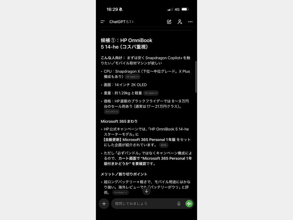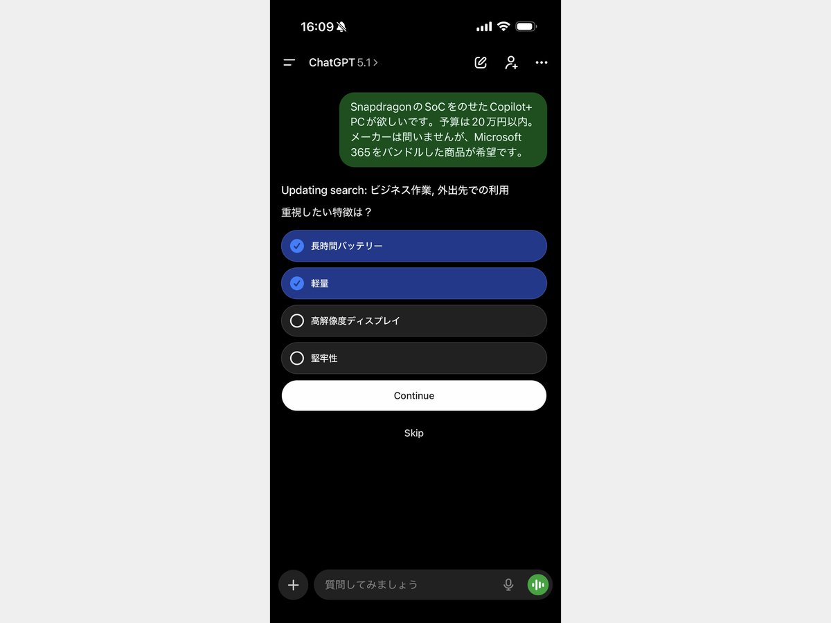 「SnapdragonのSoCをのせたCopilot+ PCが欲しいです。予算は20万円以内。メーカーは問いませんが、Microsoft 365をバンドルした商品が希望です」というリクエストをChatGPTに投げた。