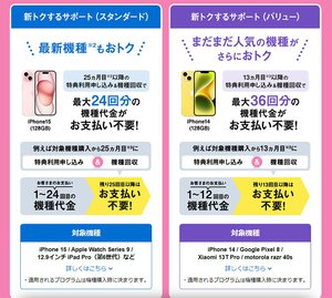 ソフトバンクのWebサイトより。同社は法改正を受けて「新トクするサポート」に「新トクするサポート(バリュー)」を追加。機種は限定されるが、1年で端末を返却することで「実質12円」といった激安価格を維持している