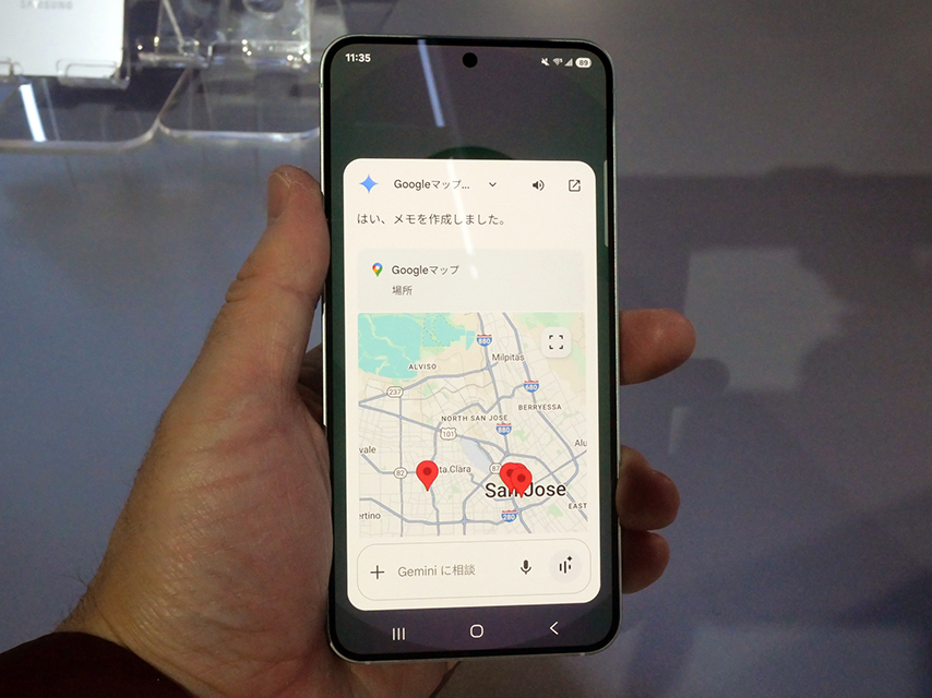 Galaxy S25でGeminiを呼び出し「おすすめのレストランをノートに書き出して」と指示したところ。まず「Googleマップ」でおすすめのレストランを数件ピックアップする