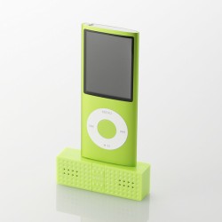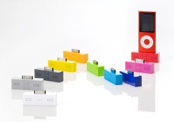 本機はiPodのDockコネクタに接続して音楽が楽しめる外付けステレオスピーカー。トイブロックのようなかわいいデザインが特徴で、第4世代のiPod nanoのカラーバリエーションに合わせた9色にホワイトを加えた合計10色が揃う。電源はiPod本体から給電できるため、スピーカー本体に電池は不要だ。本体には音調調整ができるボリュームボタンを配置。本体質量は約15g。