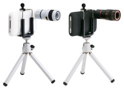 こちらは光学8倍ズームが可能な外付けレンズと、レンズ取り付けができるiPhone3G/3GS用ケース、三脚と固定ホルダーがセットになったキット。持ち運びに便利な収納ポーチや、レンズ保護キャップ、クリーニングクロスも付属する充実ぶりだ。レンズは光学8倍、F値1.1、画角は16度。視野は246m/1000mで、アイレリーフは10mm。