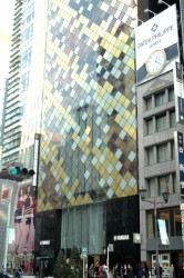 梅村 充氏ヤマハらしさを表現したという新ヤマハ銀座ビルの外装はガラス張りで、思わず眼を奪われるような個性的なデザインだ。ビルの表層は、ランダムな濃淡をつけた金箔を合わせガラスに挟み込むことで、同社の主要な事業領域である「音・音楽」の要素をきらめき、こもれびといった視覚イメージとして表現したのだという。