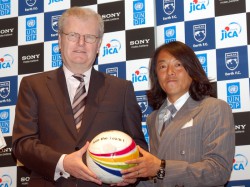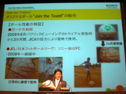 「Earth F.C.」の活動には、(財)日本サッカー協会の特任理事でJICAオフィシャルサポーターでもある元日本代表の北澤豪さんを起用。発表会で登壇した北澤さんは「地球がモチーフになっているデザインにアフリカの子供たちも理解する」と新開発のボールについて言及。「長く継続して使えるということで、子供たちが持つ夢も持続可能になってくる」と評価した。