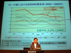 本プロジェクトは、国連が掲げる国際社会の目標「ミレニアム開発目標(MDGs)」の達成、特にHIV/エイズの蔓延防止を目的としたもの。本日行われた発表会にはソニー(株)CSR部 統括部長 冨田秀実氏らが出席し、詳細などを説明した。