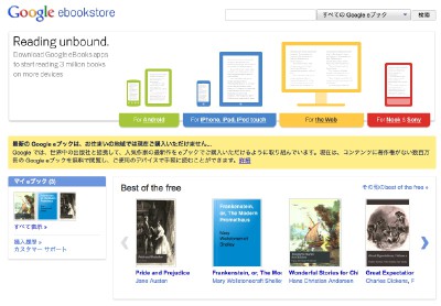 Google eブックは、様々な端末で電子書籍が読めるのが特徴。PCのブラウザーはもちろん、AndroidスマートフォンやiPhoneやiPadなどiOS端末向けのアプリケーションも用意。またバーンズ・アンド・ノーブルの「Nook」、ソニーの「Reader」などでも閲覧できる。