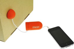 ダンボールや傘など身の回りにあるものをスピーカーとして利用可能にする製品。デジタルオーディオプレーヤーやスマートフォンなどのプレーヤーに接続後、本機の振動ヘッドを何かに取り付けることで、取り付けたものがスピーカーになる。
