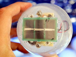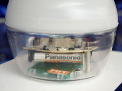 「いのり星」は、LED照明、太陽光発電パネル、充電式電池で構成されており、水につけると通電して青く光るという仕組みを採用。いずれもパナソニックが部材を提供しており、LEDには「EVERLEDS」、太陽光パネルに「HIT」、充電式電池に「エボルタ」が使用されている。